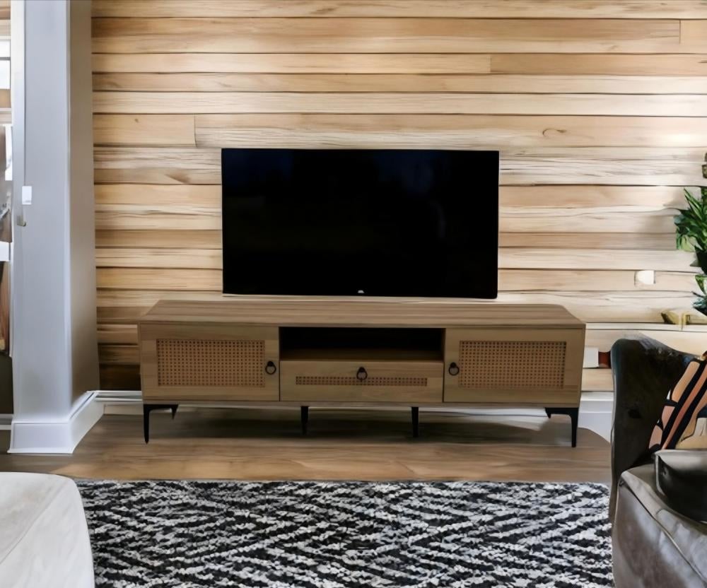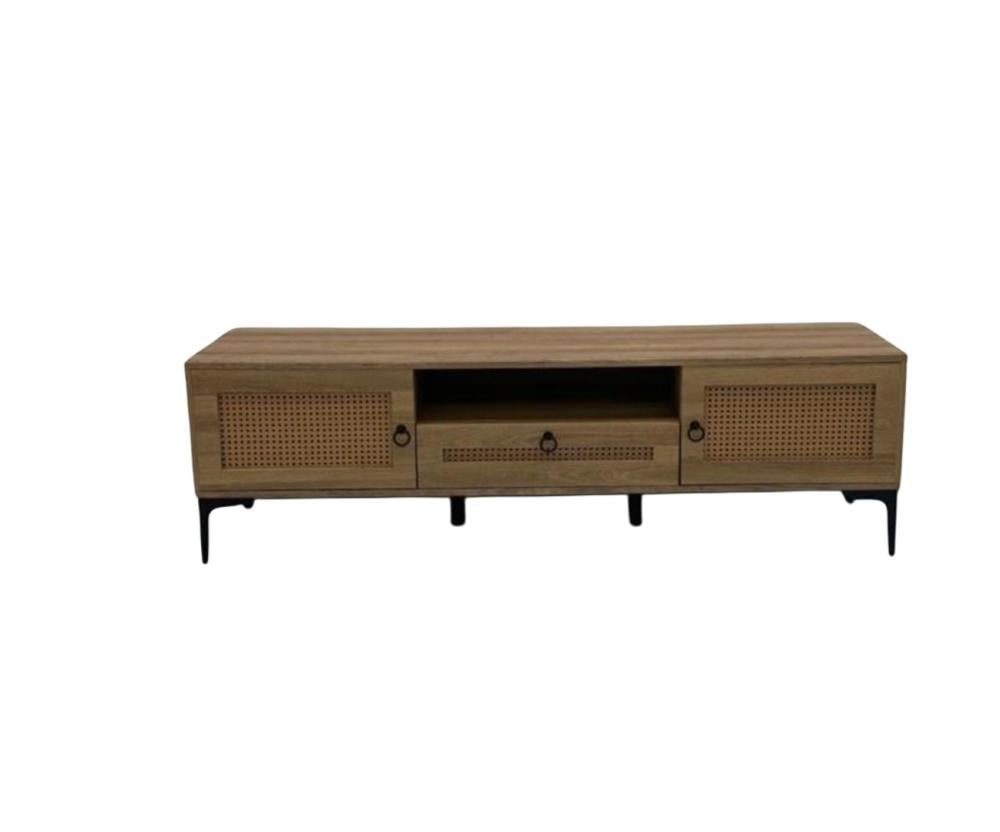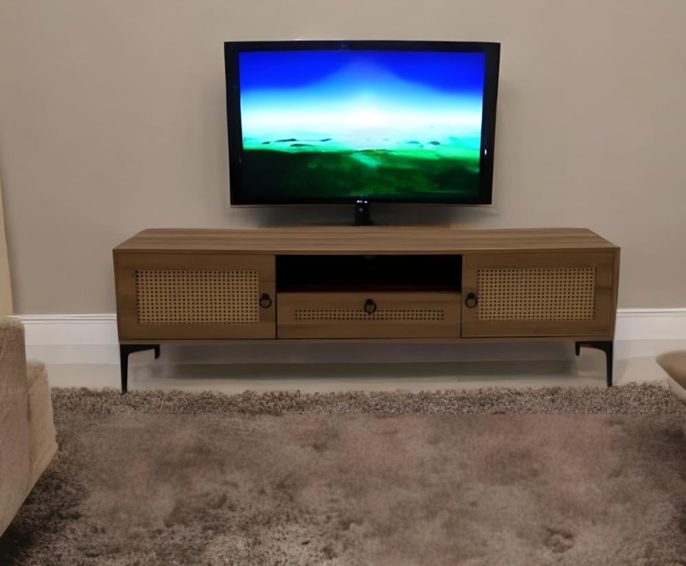 أضف لمسة من الفخامة إلى غرفة المعيشة الخاصة بك مع وحدة التلفاز الأنيقة هذه، التي تضفي مظهرًا عصريًا ومميزًا على منزلك. تم تصميم هذه الوحدة من الخشب المصمم هندسيًا، مما يضمن قدرتها على استيعاب شاشات